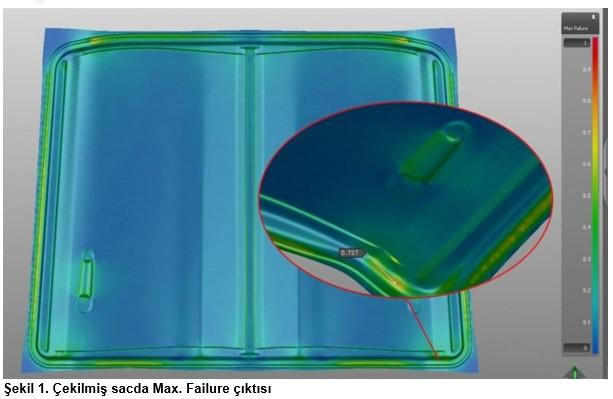 Aşağıdaki resim, çekme operasyonundan hemen sonra sacdaki, AutoForm’da “maksimum Failure” olarak adlandırılan çıktı değişkenini göstermektedir. Burada kullanılan renk ölçeği görüntünün sağ tarafında gösterilmektedir.