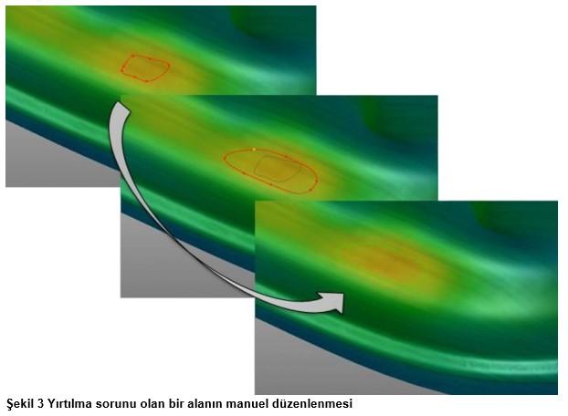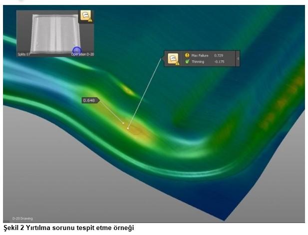 Yukarıdaki çıktı yazılım tarafından otomatik olarak yaklanan sorunlardan birini göstermektedir. Gördüğünüz gibi yazılım hesaplanan maksimum failure çıktısının (0.729) sınırı (0.7) aştığı bir alanları (kapalı eğri) tanımlayarak gruplandırmıştır; bu örnekte İnceltme (% 17,5) değeri izin verilen maksimum sınırın (% 25) altındadır fakat max. failure’dan dolayı sorun tespit edilmiştir.