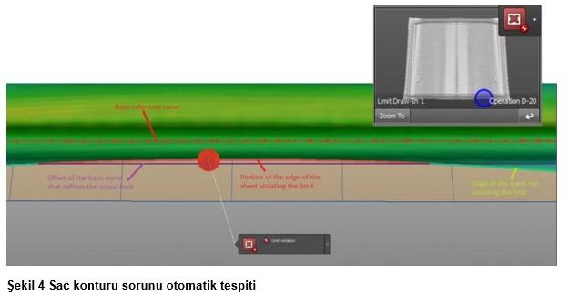 Örneğin, çekme operasyonu sırasında sac kenarının süzme kanalını aşıp kurtulmasını önlemek istiyoruz. Bu sonucu panelin kenarı boyunca görsel olarak kontrol etmek yerine, bu limiti temsil eden eğriyi tanımlamak ve yazılımın çekilmiş sac kenarının bu eğriyi geçip geçmediğini algılamasını sağlamak mümkündür.