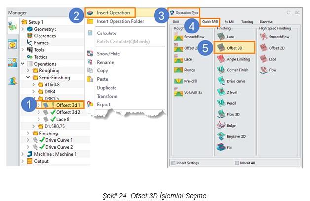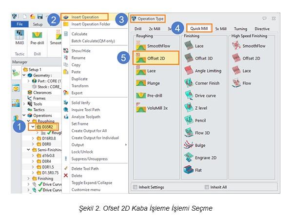 D35R2 adlı klasöre sağ tıklayın, İşlemi Ekle (Insert Operation) öğesini seçin. Ardından, İşlem Tipi (Operation Type) iletişim kutusunda, Hızlı Freze (Quick Mill) sekmesi altında Ofset 2D’yi seçin.