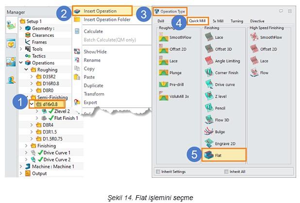 D16R0.8 takımı burada da kullanılır. D16R0.8 adlı klasöre sağ tıklayın, İşlem Ekle’yi seçin ve İşlem Tipi iletişim kutusunda Hızlı Freze sekmesi altında Düz’ü seçin.