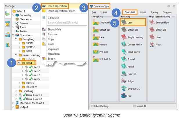 Şimdiye kadar tüm yüzeyler D16R0.8 takımıyla işlendi. İşlenecek yalnızca nispeten küçük bir R açısı (R0.5) kaldığı için D8R4 aracı kullanılmalıdır. D8R4 adlı klasöre sağ tıklayın, İşlem Ekle’yi seçin ve İşlem Tipi iletişim kutusunda Hızlı Freze sekmesi altında Lace’i seçin.