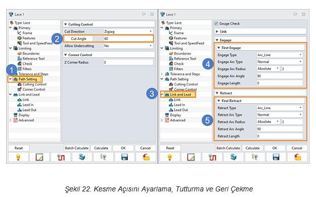 Yol Ayarı menüsünde Kesim Açısı’nı, ardından Bağlantı ve Yönlendirme menüsünde Etkileşim ve Geri Çekme (Engage ve Retract) modlarını ayarlayın.